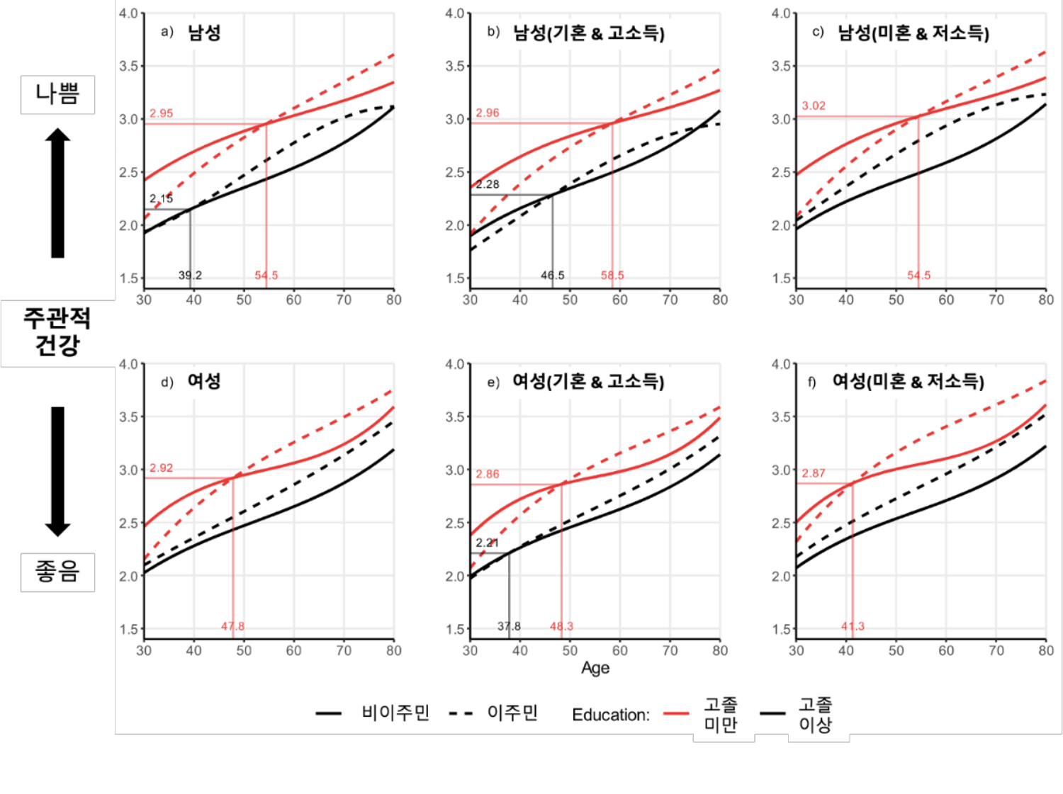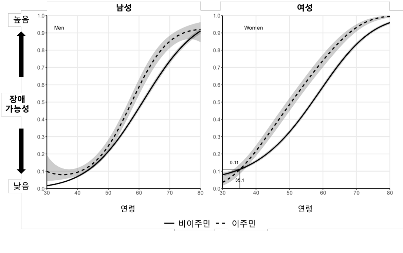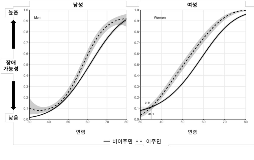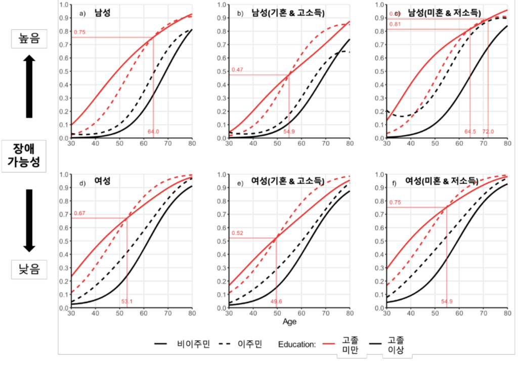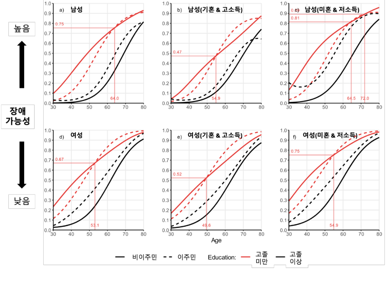 추가 세부 분석으로 교육 수준을 고등학교 졸업 미만과 고등학교 졸업 이상으로 구분하여 보았다. 교육 수준이 높을수록 전반적으로 건강 수준이 더 높았으나, 높은 교육 수준이 이민자의 건강 악화 속도를 완화하지는 않았다. 주관적 건강에서 고졸 이상 남성 이주민은 39.2세까지는 비이주민보다 나은 건강 결과를 보였으나, 고졸 이상 여성 이주민에서는 전 연령에서 비이주민보다 주관적 건강이 나빴다[그림3]. 장애 가능성에서는 남녀 모두 고졸 이상 이주민도 전 연령에서 비이주민보다 장애 가능성이 높았다[그림4]. 더불어 결혼 상태와 소득 수준을 고려했을 때도 이주민의 건강 악화에 대한 보호 효과는 확인되지 않았으나, 미혼이면서 저소득인 여성 이주민에서 건강 악화가 가속화된다는 점은 명료하게 확인되었다.