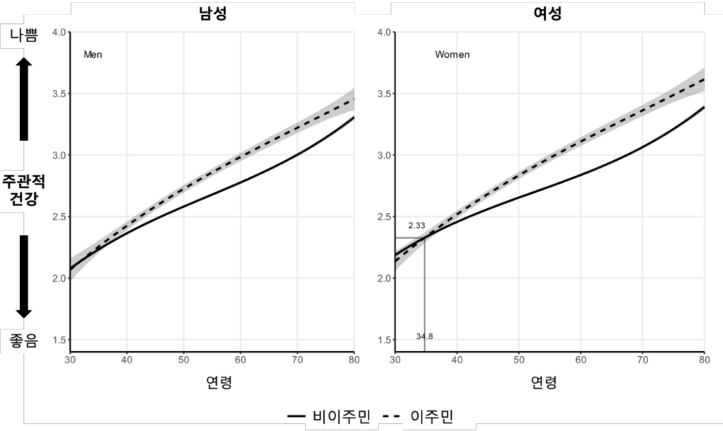 먼저 이주민과 비이주민의 연령에 따른 주관적 건강 결과를 보면, 남녀 모두에서 연령이 증가함에 따라 이주민의 주관적 건강이 비이주민에 비해 더 나쁜 것을 확인할 수 있었다. 특히 여성에서는 34.8세 이전에는 이주민 여성이 더 좋은 주관적 건강을 보였으나, 이후에는 결과가 교차하는 현상이 나타났다[그림1]. 장애에서도 연령이 증가함에 따라 남녀 모두에서 이주민이 비이주민보다 장애 가능성이 높았고, 여성 이주민의 경우는 35.1세 이전에는 비이주민 여성보다 낮은 장애 가능성을 가졌으나 이후 교차하는 결과를 보였다[그림2].