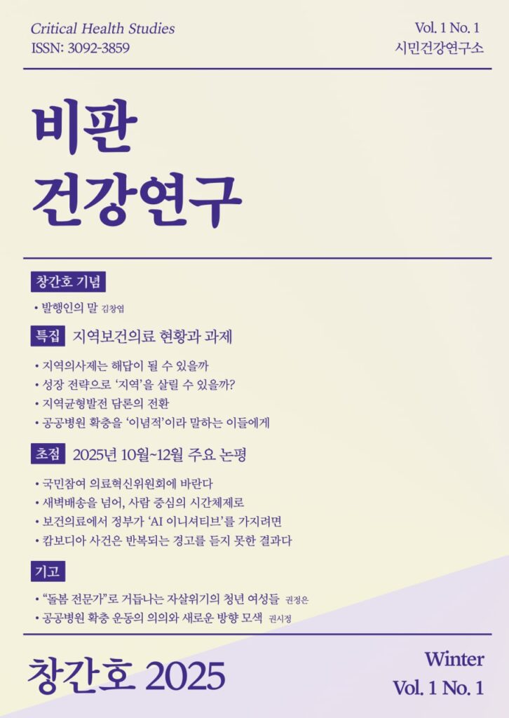 이번 창간호에는 ‘지역보건의료의 현황과 과제’를 주제로 엄선한 기존 논평 4편과 2025년 4분기 주요 논평 4편을 실었습니다. 아울러 연구소 영펠로우 출신인 권정은(2022년), 권시정(2021년)의 박사학위 논문 과정에서 얻은 발견과 통찰을 담은 기고글도 함께 수록했습니다.