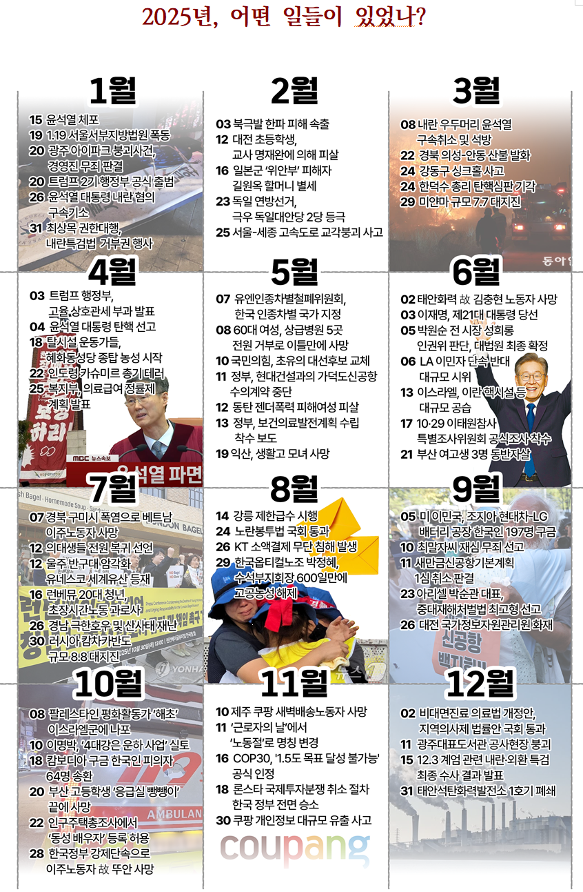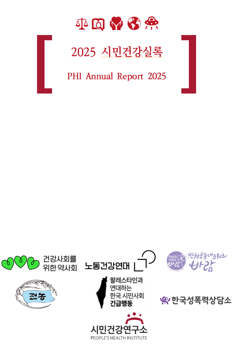 2025년의 대한민국은 12.3 내란에 대한 역사적, 정치적 의미를 따지고 책임을 묻는 시간과 12.3 내란 이후의 새로운 사회 구성의 원리에 대한 경합의 시간이 동시에 전개되었다고 할 수 있습니다. 국제적으로는 극우세력의 발흥으로 각국이 민주주의의 후퇴와 정치적 불안정을 겪고 있으며, 국지적으로 벌어지고 있는 집단학살과 전쟁의 전장은 오히려 더 넓어졌습니다. 이런 정세 속에서 시민건강연구소는 건강과 인권, 정의와 형평의 관점에서 꼭 기억하고 앞으로도 지켜봐야 할 사건들을 선별해 <2025 시민건강실록>을 작성했습니다. 시민건강연구소 회원들과 건강사회를 위한 약사회, 노동건강연대, 인권운동네트워크 바람, 전국농민총연맹, 팔레스타인과 연대하는 한국시민사회 긴급행동, 한국성폭력상담소에서 공동작업에 함께 해주셨습니다. 비판적인 통찰로 <2025 시민건강실록>이 완성되도록 도움을 주신 모든 분들께 다시 한번 깊이 감사드립니다.