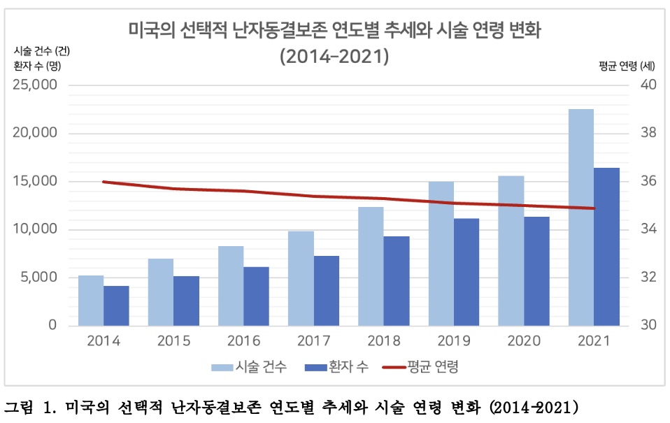 미국에서도 선택적 난자동결보존을 시행한 여성의 수는 빠르게 증가했다. 난자를 동결한 여성이 2014년 4,153명에서 2021년 16,436명으로 약 네 배 가까이 늘었고, 시술 건수도 2014년 5,259건에서 2021년 22,545건으로 크게 늘었다. 반면에 난자를 동결한 시점의 평균 연령은 같은 기간 36세에서 34.9세로 낮아졌다[그림1].