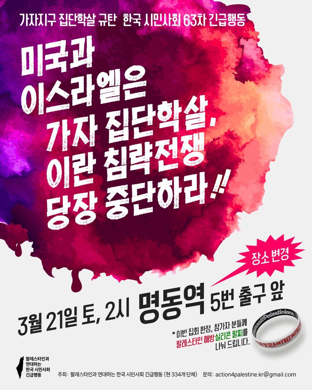 ⛺️ 장소: BTS 공연 때문에 낮에도 이스라엘 대사관 인근 원래 집회 장소가 진입 차단돼서 명동역 5번 출구로 장소를 바꿨습니다.