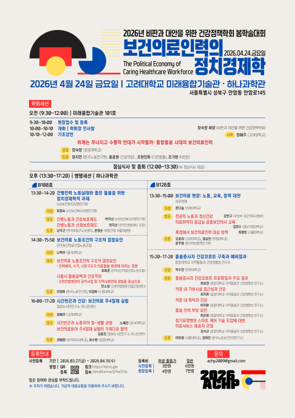 소식 2026년 건강정책학회 봄 학술대회 2026.04.14 25회 조회됨 비판과 대안을 위한 건강정책학회에서는 ‘보건의료인력의 정치경제학’을 주제로 4월 24일(금) 고려대학교 서울캠퍼스 미래융합기술관 • 하나과학관에서 봄 학술대회를 개최합니다. 자세한 내용은 학회 홈페이지를 참고하세요. 사전등록: 링크 시민건강연구소 정기 후원을 하기 어려운 분들도 소액 결제로 일시 후원이 가능합니다. 추천 글 [2026년 상반기 서리풀학당] 의료AI 해부하기: 기술, 윤리, 정치경제 비판건강연구 투고/편집 규정 📢 유튜브 채널을 개설하였습니다 [2025년 하반기 서리풀학당] 한국 건강보험의 정치경제