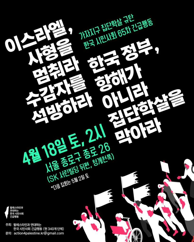 거리로 나옵시다. 사형법도, 가자 봉쇄도 함께 깨부숩시다.